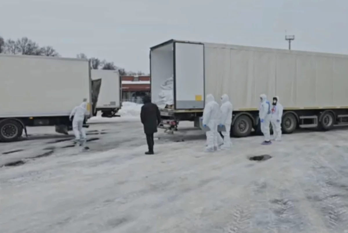 На опубликованных кадрах запечатлены грузовые автомобили, с которых производится выгрузка тел, упакованных в белые мешки. Сотрудники, осуществляющие погрузку, проводят подсчет переданных останков.