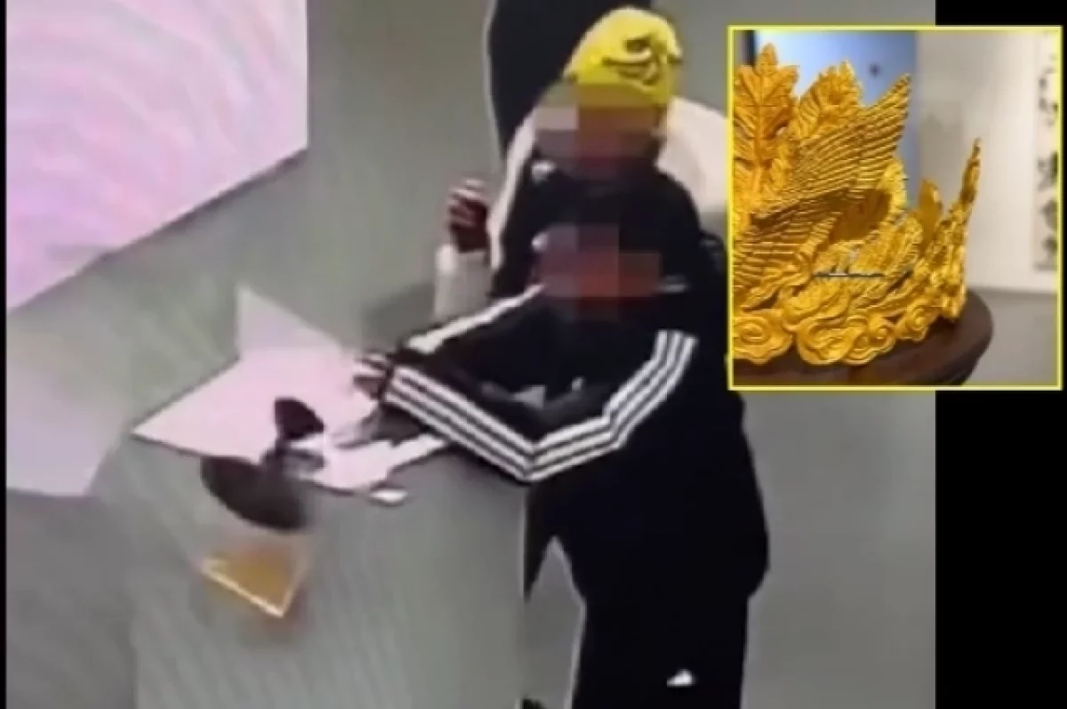 На видео – мальчик лет 10 внимательно рассматривает корону, которая находится в стеклянном кубе. Затем он опирается на тумбу, мать отодвигает его и хочет сфотографировать экспонат. Ребенок начинает активно жестикулировать и сбивает куб вместе с короной. На место спешат сотрудники музея.