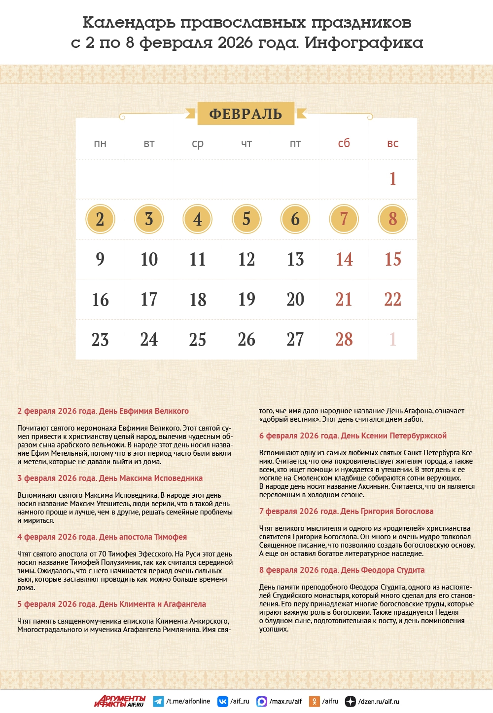 Календарь православных праздников с 2 по 8 февраля 2026 года. Инфографика
