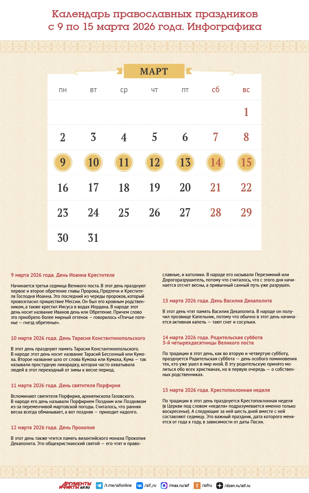 Календарь православных праздников с 9 по 15 марта 2026 года. Инфографика