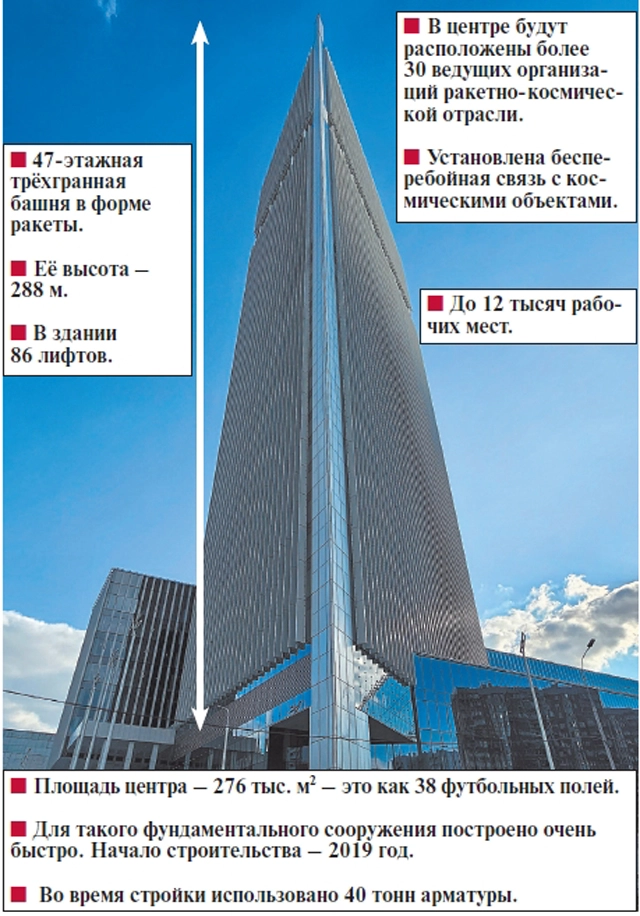 Неподготовленного зрителя Национальный космический центр действительно способен удивить. Его площадь составляет 276 тыс. кв. м. На ней расположено несколько зданий, высотой в 8-10 этажей, пространство между которыми накрыто единой стеклянной крышей. Благодаря этому получился красивый крытый атриум с потолками на уровне четвертого этажа, под сводами которого развесили красивые лампы и оригинальные детали спутников. На самой аллее уже сейчас разместили оригиналы различных космических аппаратов. Центральная 47-этажная башня, высота которой составляет 288 м, выполнена в форме ракеты, установленной на стартовой площадке, стремящейся ввысь. Она занимает 10 место в списке самых высоких зданий Москвы.
