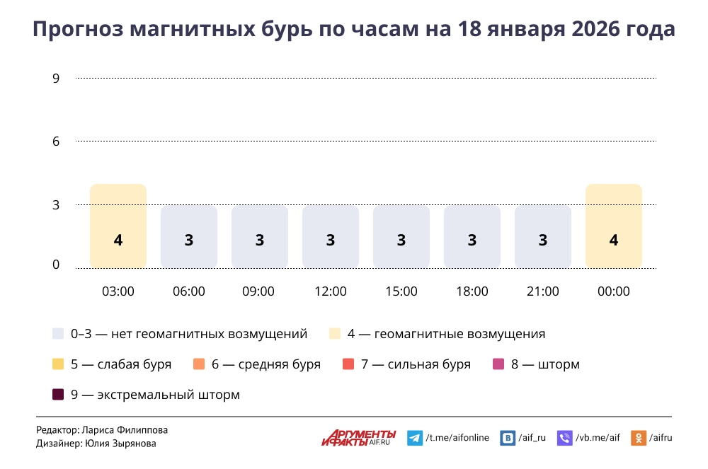 Прогноз магнитных бурь по часам на 18 января 2026 года. Инфографика