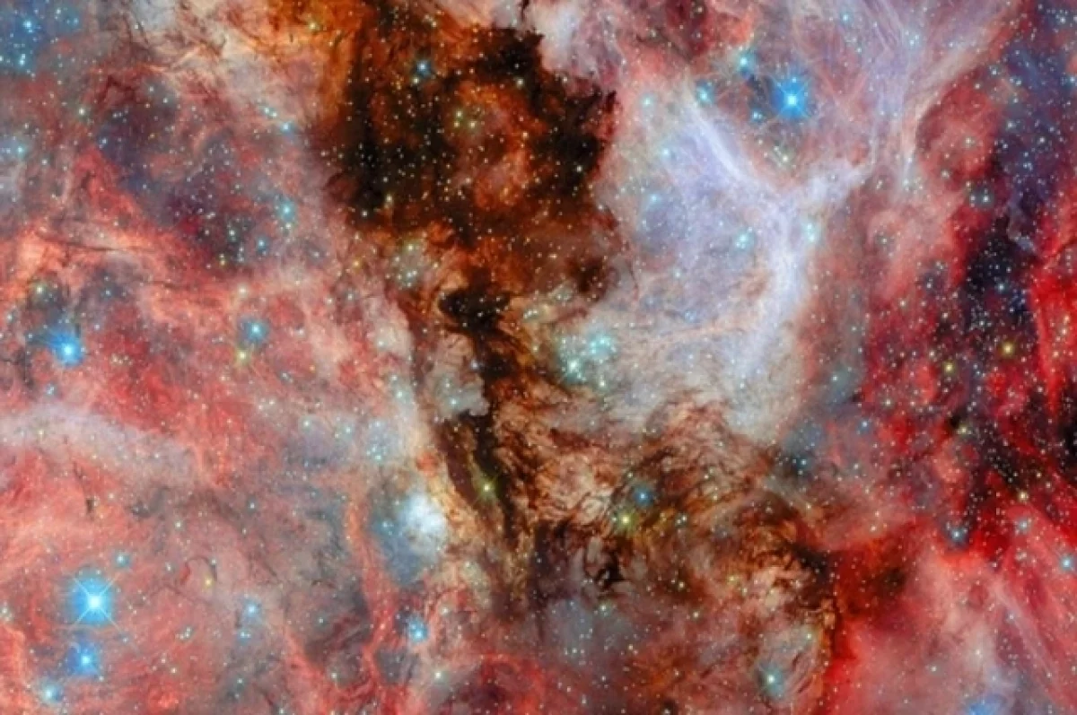 «Густые облака холодного водорода – топлива для звезд – извиваются над огромной областью, светясь глубоким красным там, где формируются и горят молодые звезды. Некоторые нестабильные звезды разнесли своё окружение мощными звездными ветрами, вырезая гигантские пузыри в газе», – говорится в материале.