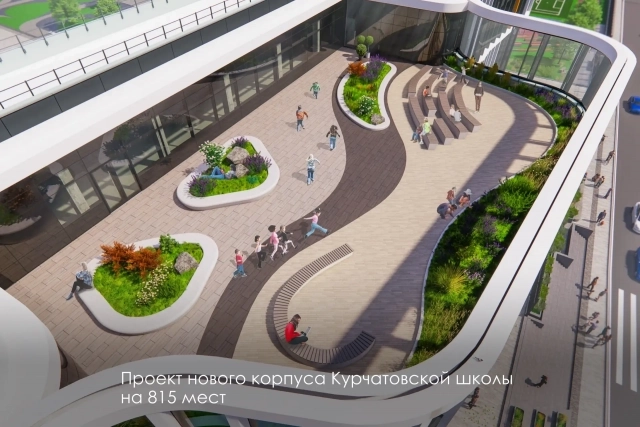 Пространства внутри обустроят по принципу «школа-город» — вместо обычных коридоров появятся своеобразные улицы с рекреационными зонами. Рядом с корпусом обустроят спортивную территорию.