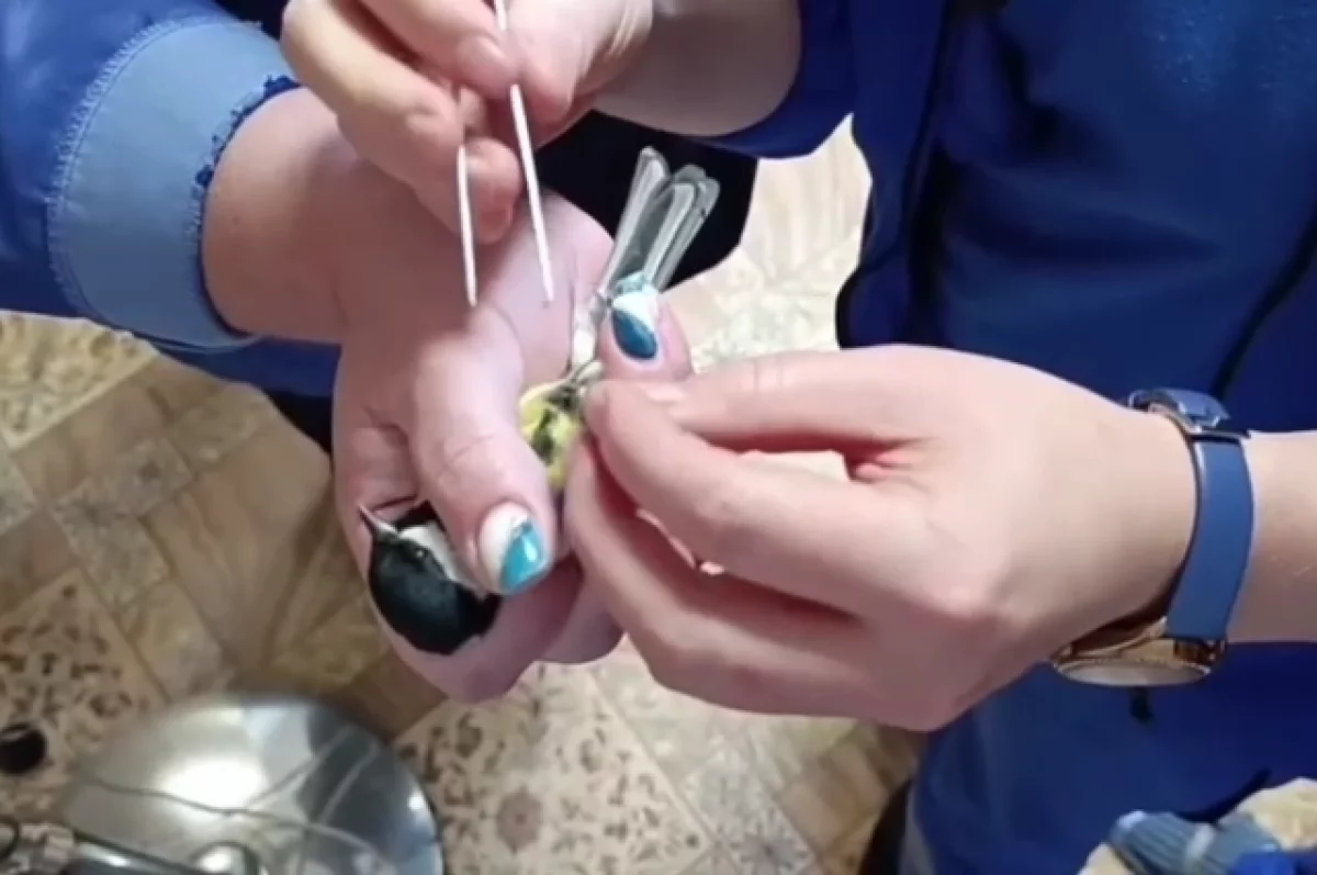 Отмечается, что голова и лапки птицы после падения оказались в стекловате. Старший фельдшер Юлия Анисимова и фельдшер Татьяна Ямбаршева очистили перья и конечности синицы, напоили ее из шприца. После этого птица улетела.