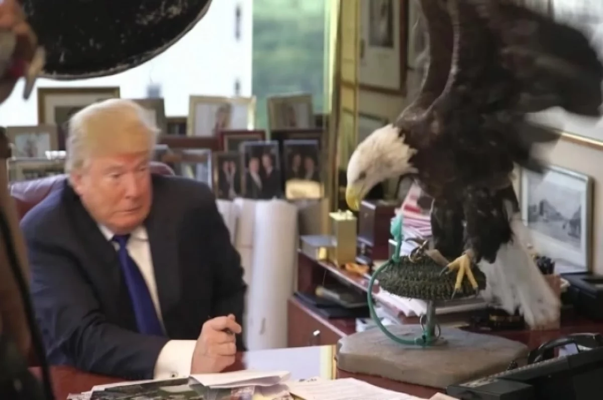 На ролике орёл ведёт себя агрессивно по отношению к Трампу, пытаясь ухватить его за голову.
