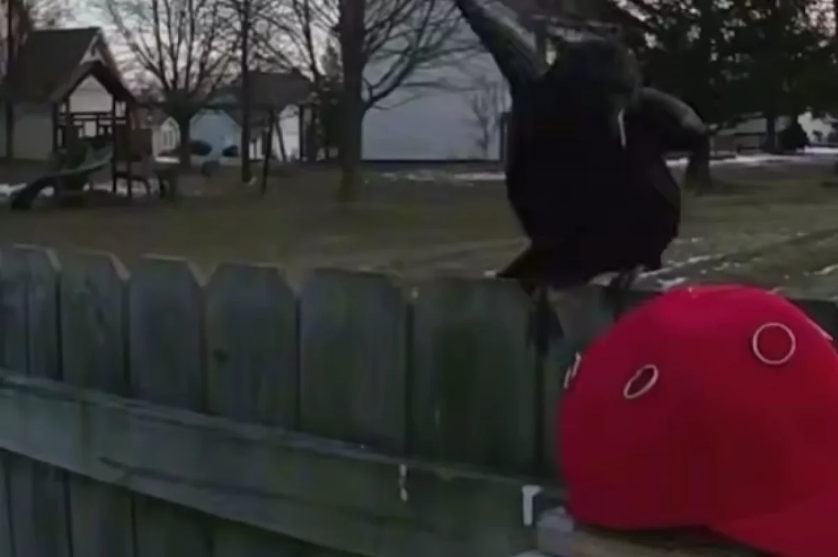 На распространенном в соцсетях видео ворона подлетает к красной кепке, которая лежит на кормушке у забора. Птица начинает клевать головной убор, пока он не падает. Под кепкой оказывается еда, на которую слетаются другие вороны.