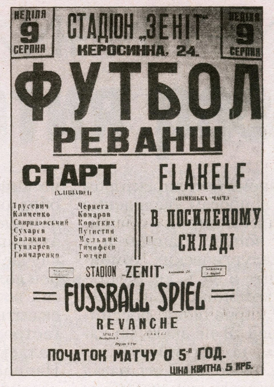 9 августа 1942 года на киевском стадионе «Старт» состоялся матч между одноименным коллективом и немецкой командой Flakelf. Поединок закончился со счетом 5:3 в пользу «Старта».