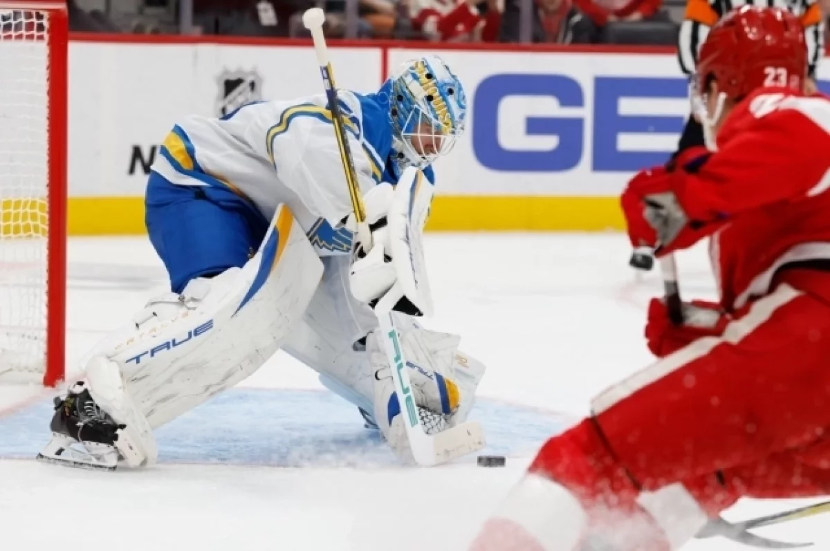 Канадский хоккеист, вратарь «Сент-Луис Блюз» Джордан Биннингтон попытался забрать себе шайбу, которой российский спортсмен Александр Овечкин, выступающий за «Вашингтон Кэпиталз», забил 900-й гол в карьере в НХЛ.
