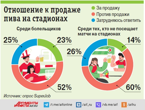 Но и на этом фоне, как ни удивительно и вопреки мнению пивных лоббистов, сторонники возврата этого напитка на стадионы в общероссийском масштабе вовсе не в большинстве. Согласно недавнему соцопросу (компании SuperJob), сторонников возврата действительно больше среди активных болельщиков (23%), чем среди тех, кто не интересуется спортивными событиями, в принципе (14%). Однако даже среди спортивных болельщиков более половины (52%) против. Так что, если закон о возврате пива на стадионы будет принят, то знайте, что в спорах просто «по очкам» победили деньги. Которых лишних сейчас на спорт не так чтобы много.