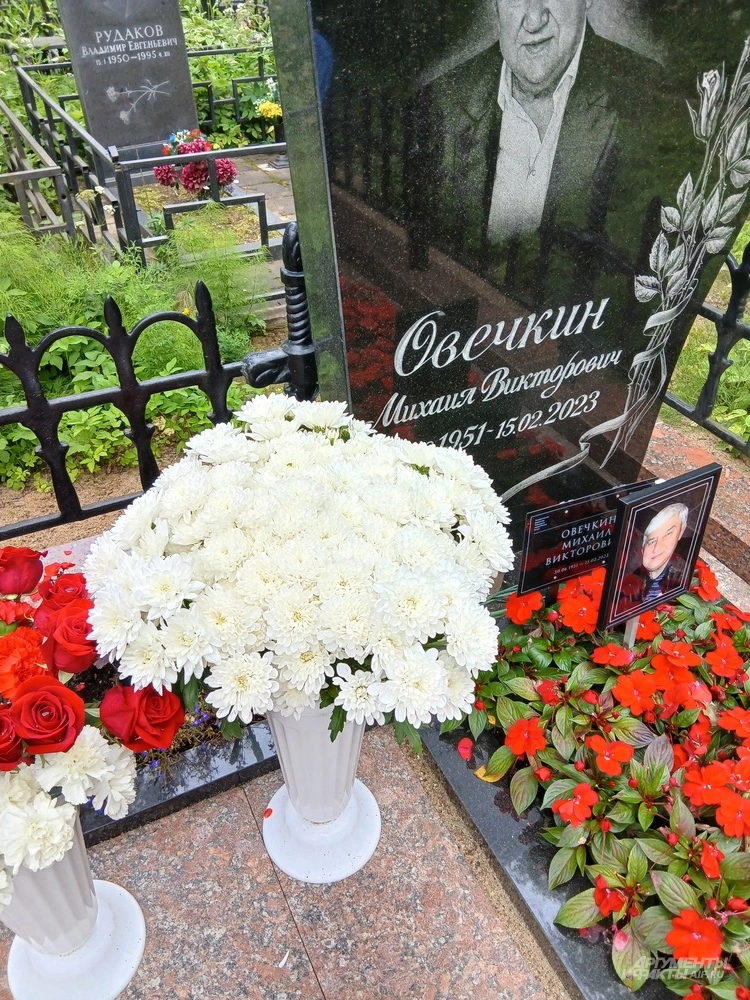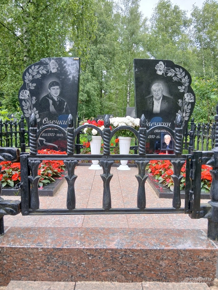 Могила Овечкиных не отличается чрезмерной помпезностью. Видно, что все сделано с большой любовью и заботой. Гранитное основание, два симметричных цветника, засаженные живыми цветами — красными бальзаминами, невысокая черная кованая ограда. Здесь очень чисто и ухожено. За оградой стоят маленький столик и лавочка, рядом брезентом накрыты стулья: чтобы можно было расположиться, придя сюда к своим любимым. В вазах стоят живые цветы: недавно был день рождения у Михаила Викторовича, ему исполнилось бы всего 74 года.