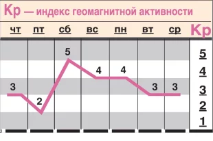 В четверг прогнозируют магнитную бурю (Кр 5), в среду магнитосфера возмущённая (Кр 4). При болезнях сердца и сосудов в эти и смежные дни тщательнее следите за здоровьем и строго соблюдайте назначения врача.