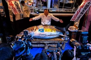 Голубого тунца весом в 240 килограммов продали за 3,2 млн долларов на рыбном аукционе в Токио.