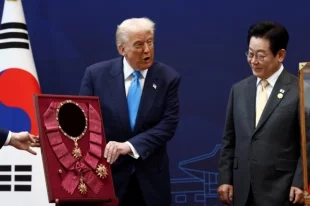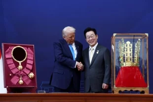 Президент Южной Кореи Ли Чжэ Мён вручил американскому лидеру позолоченную копию короны древнего корейского государства Силла.