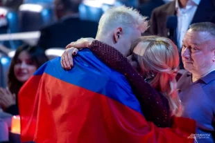 Выступление артиста началось с эффектного появления на балконе, где он размахивал флагом России.