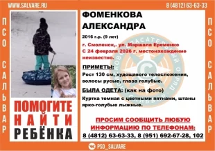 В Смоленске разыскивают девятилетнюю девочку. Утром 24 февраля она вышла во двор с собакой и не вернулась.