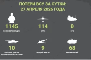Минобороны РФ опубликовало данные о потерях ВСУ за 27 апреля. Противник не досчитался 1145 военнослужащих.