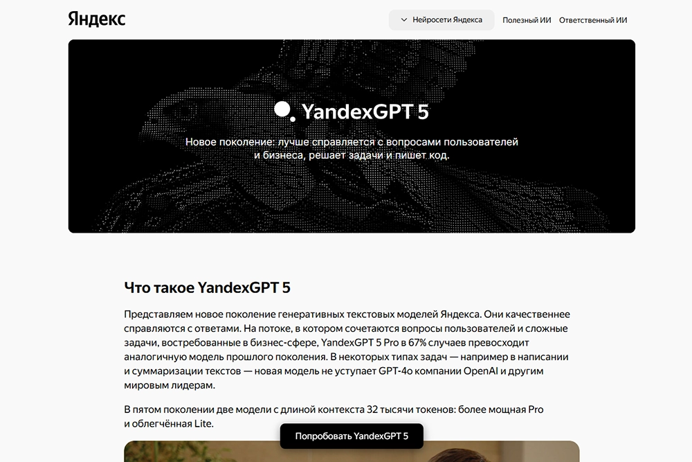 Яндекс GPT — собственная языковая модель компании Яндекс, разработанная как альтернатива западным решениям для генерации текста, ведения диалога и автоматизации задач. Модель встроена в поисковик, голосового помощника Алису, Яндекс 360, браузер и почту, то есть доступна пользователям прямо в привычных интерфейсах.