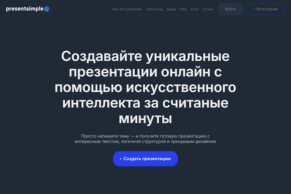 Presentsimple.ai — российская ИИ-платформа для быстрого создания презентаций по описанию на русском языке. Пользователь вводит короткий запрос, например, «презентация про экологию для 7 класса» или «слайды для презентации проекта», и уже через минуту получает готовый набор слайдов со структурой, текстом и иллюстрациями.