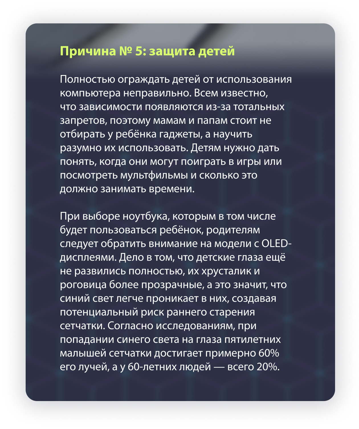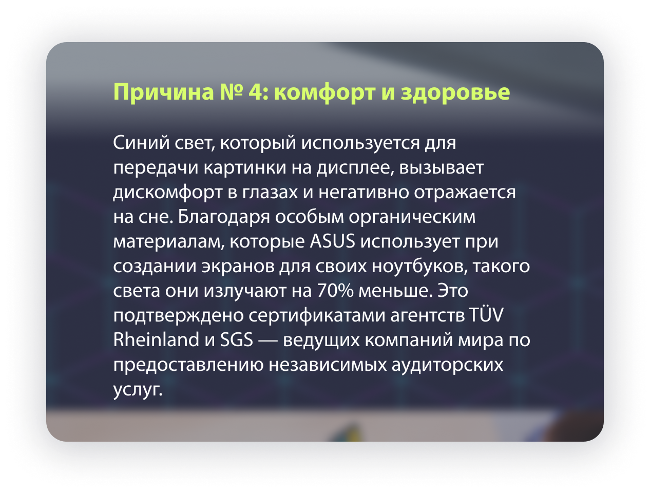 Клавиатура ноутбука оборудована светодиодной подсветкой. А это значит, что работать на нём можно даже в полной темноте: клавиши всё равно будет отлично видно. Их яркость, кстати, регулируется. Добавим к этому безопасный для глаз экран — и получим девайс, который можно использовать днём и ночью.